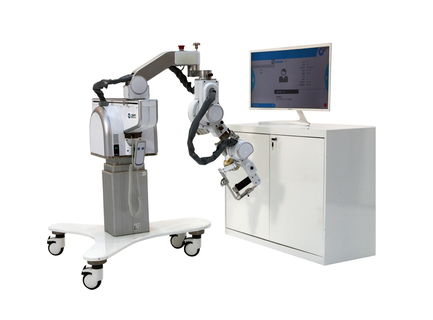 上肢康复训练与评估系统主要是根据脑部神经可重塑这一最新研究成果,应用科学的康复策略,通过主动、被动、助力、示教等训练模式,结合虚拟现实,提高患者训练的趣味性和积极性,最终使患者上肢运动功能部分或完全康复。其中,主动训练:患者需克服自身的重力根据系统设定的虚拟现实场景完成相应的上肢关节活动训练;被动训练:患者在设备的带动下完成相应的上肢关节活动训练;助力训练:系统根据患者的实际情况给予患者相应的助力补偿,患者根据系统设定的虚拟现实场景完成相应的上肢关节活动训练;示教模式:患者的自身重力由机器辅助,由医师决定运动轨迹。